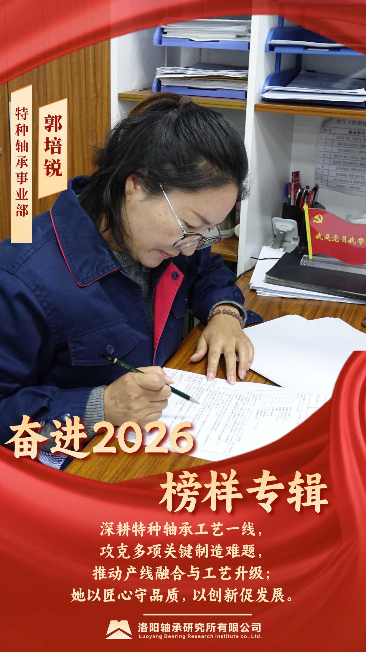 郭培銳同志自2019年入職以來(lái),一直從事特種軸承工藝技術(shù)研究工作,先后參與省部級(jí)項(xiàng)目5項(xiàng)、發(fā)表論文6篇并獲多項(xiàng)專利及軟著,2024年12月榮獲全國(guó)機(jī)械工業(yè)產(chǎn)品質(zhì)量創(chuàng)新大賽金獎(jiǎng)。她擔(dān)任工藝技術(shù)室主任后,面對(duì)部門融合、任務(wù)倍增的挑戰(zhàn),主動(dòng)擔(dān)當(dāng),牽頭完成237臺(tái)設(shè)備搬遷就位、36份制度文件融合、3300余份工藝優(yōu)化編制等項(xiàng)艱巨任務(wù),保障產(chǎn)線平穩(wěn)過(guò)渡。在質(zhì)量攻堅(jiān)中,她帶領(lǐng)團(tuán)隊(duì)完成63批次首件鑒定、處理現(xiàn)場(chǎng)問(wèn)題400余個(gè),攻克多項(xiàng)技術(shù)難題,并積極推進(jìn)信息化建設(shè),為公司技術(shù)提升與穩(wěn)健發(fā)展筑牢堅(jiān)實(shí)基礎(chǔ)。柔肩擔(dān)重任,巾幗綻芳華。她以匠心守品質(zhì),以創(chuàng)新促發(fā)展。