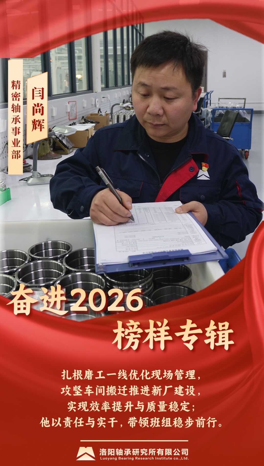 閆尚輝作為精密軸承磨工車間班組長,始終扎根生產(chǎn)一線,以務(wù)實(shí)的作風(fēng)和過硬的本領(lǐng),帶領(lǐng)團(tuán)隊(duì)圓滿完成各項(xiàng)任務(wù)。在磨工現(xiàn)場管理中,他持續(xù)優(yōu)化生產(chǎn)秩序,推動(dòng)車間面貌煥然一新,產(chǎn)品不良率顯著下降,生產(chǎn)效率大幅提升,現(xiàn)場管理水平實(shí)現(xiàn)新飛躍。面對(duì)新廠區(qū)搬遷任務(wù),他牽頭制定詳細(xì)進(jìn)度計(jì)劃,將設(shè)備拆卸、運(yùn)輸、安裝、調(diào)試等環(huán)節(jié)細(xì)化到人,并帶隊(duì)駐扎現(xiàn)場,確保搬遷高效推進(jìn),最終提前完成整體搬遷任務(wù)。他以高度的責(zé)任心和使命感,在平凡崗位上創(chuàng)造了不平凡的業(yè)績。