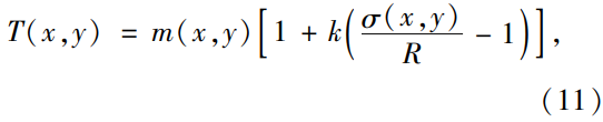 式中:R為標(biāo)準(zhǔn)方差的動(dòng)態(tài)范圍,本文檢測(cè)對(duì)象為八位灰度圖,故R取128;k為調(diào)整系數(shù),Sauvola算法的優(yōu)點(diǎn)在于k的微小變化不會(huì)顯著影響二值化的結(jié)果。